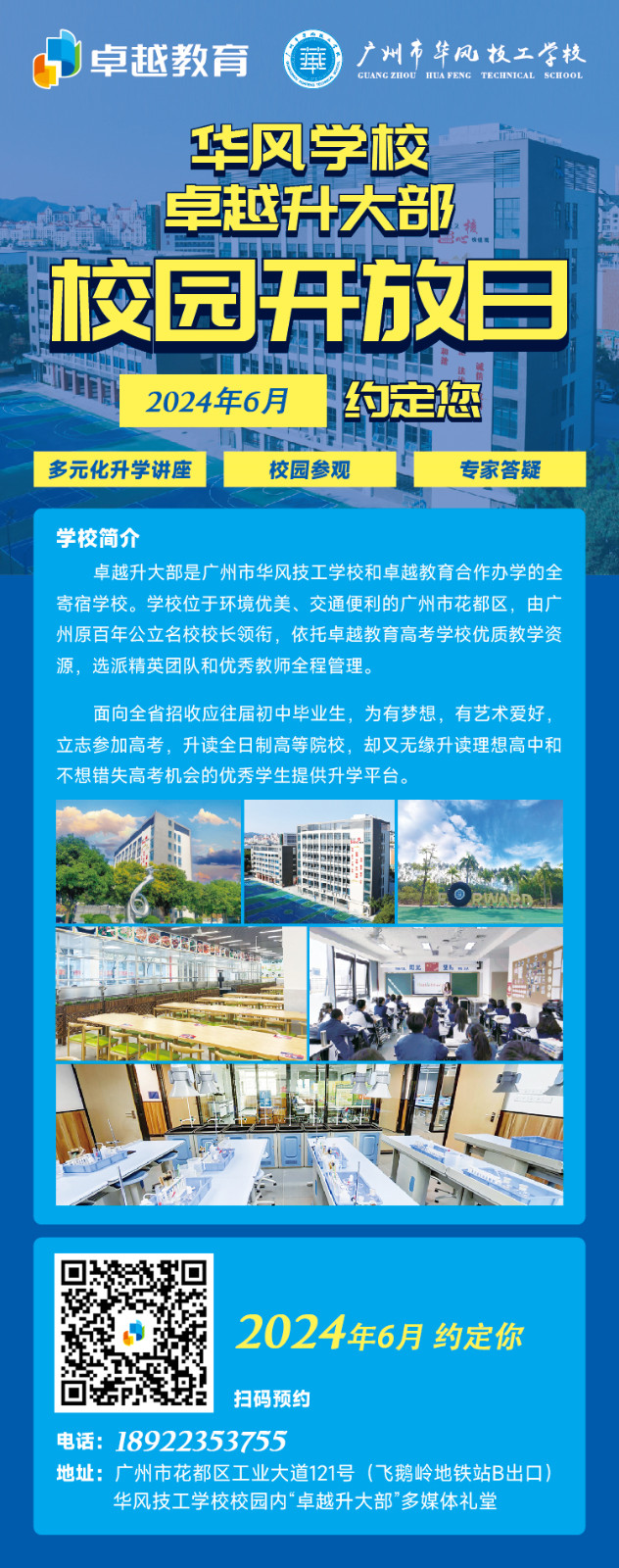 为了帮助初中毕业生们提前做好升学规划,帮助想要参加高考、升读全日制高等院校的初中毕业生圆梦,由拥有22年高考学校办学经验的卓越教育开办的华风学校·卓越升大部,学校开放日来啦!