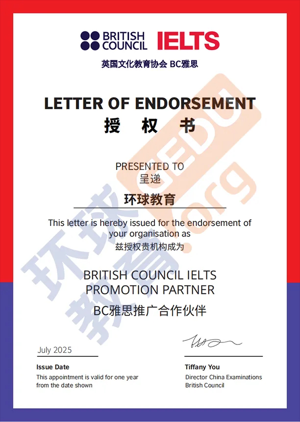 1997年, 环球教育在北京落地生根,从此开启了它的教育征程。2011年,加入全球教育巨头培生集团(Pearson),依托其170多年的教育积淀和国际资源,开启国际化新篇章。 2017年,成为朴新教育科技集团成员,进一步夯实发展基础。 2025年,环球教育载誉前行——再度斩获“综合实力语言培训品牌”称号,并“连续多年获得雅思考试官方白金级合作伙伴认证”,成为国内少数同时获得多项国际语言测评体系认可的教育品牌。这些成就源于对教学品质的“极致追求”,更是28年积累的信任勋章。