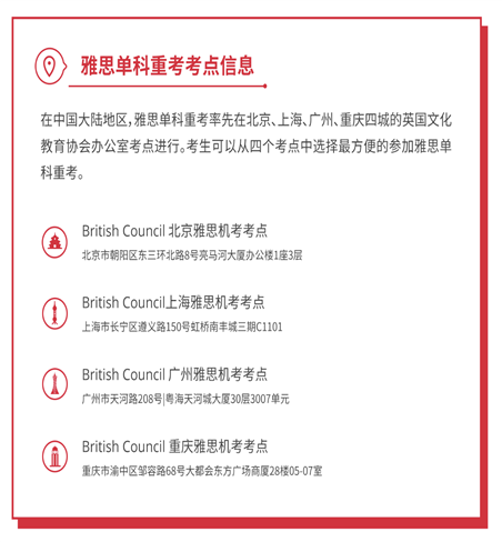 在中国大陆地区,雅思机考单科重考将率先在北京、上海、广州、重庆四城的英国文化教育协会办公室考点开放。考生可以从四个考点中选择最方便的地点参加雅思机考单科重考。
